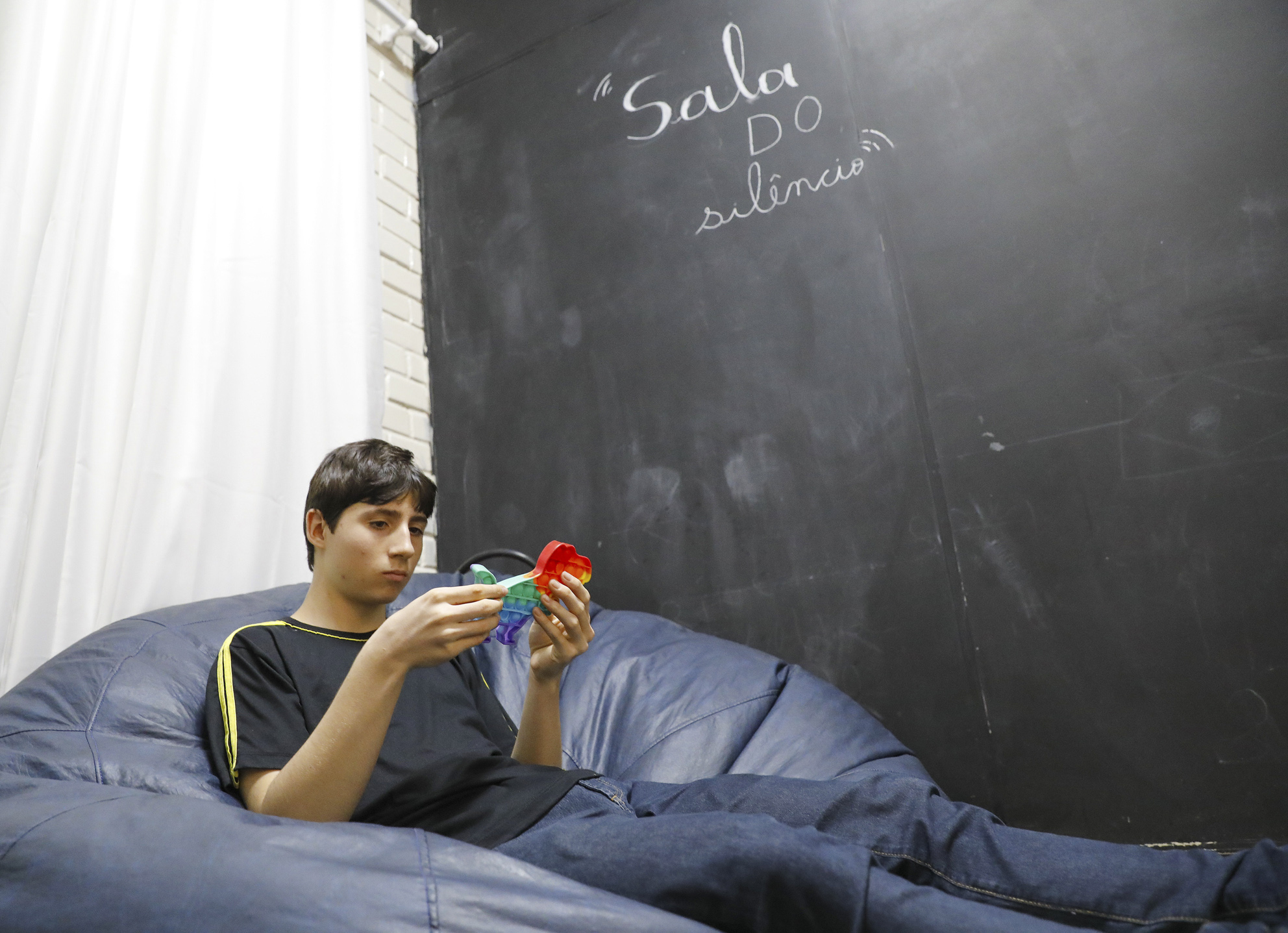 Felipe Ferreira, 14 anos, é autista e estudante do 8º ano da escola. Para ele, o espaço é importante para se tranquilizar em alguns momentos. “A sala consegue me ajudar a relaxar. Lá tem vários brinquedos, um pufe para sentar. Eu me sinto muito feliz quando saio de lá. Eu amo muito essa escola”, compartilhou.