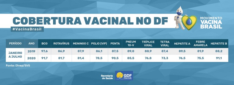 O Ministério da Saúde preconiza em 90% a cobertura para as vacinas BCG e contra o rotavírus e 95% para as demais vacinas indicadas na rotina do calendário nacional de vacinação. No primeiro semestre, embora várias vacinas não tenham atingido a meta, a pentavalente (que protege contra a meningite, difteria, tétano, coqueluche e hepatite B) e a que previne a hepatite B ultrapassaram o percentual alcançado no mesmo período de 2019.
