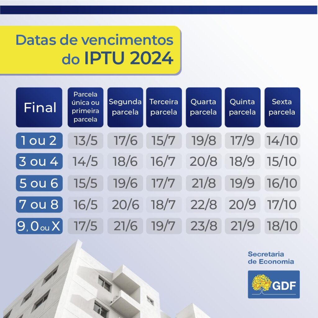 Imposto sobre Propriedade Predial e Territorial Urbana (IPTU) de 2024 chega à segunda parcela de pagamento. A data de vencimento é de acordo com o número final (dígito verificador) da inscrição do imóvel no Cadastro Imobiliário do Distrito Federal (CIDF) e começa a vencer entre segunda-feira (17) e sexta-feira (21).
