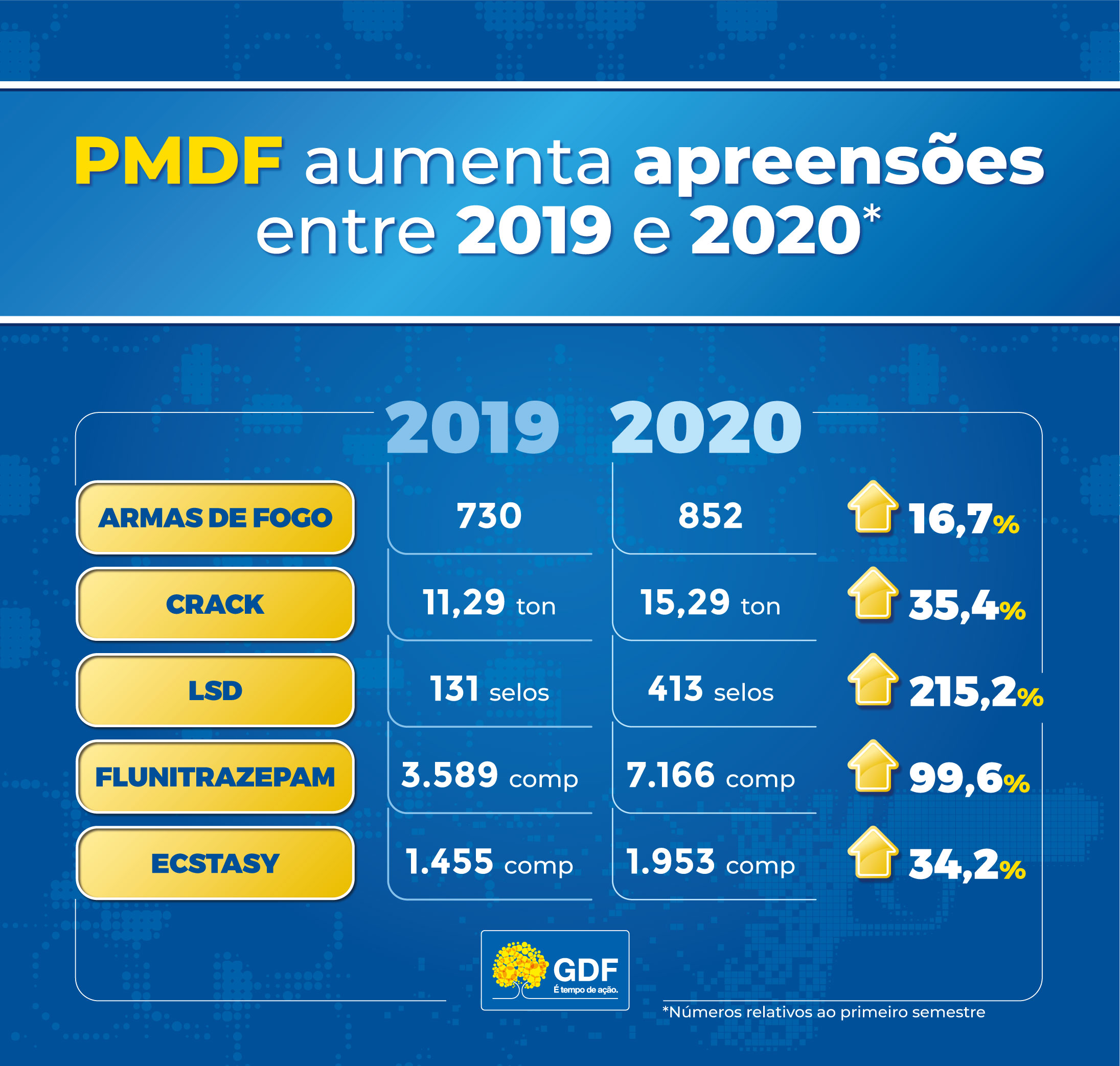 A Polícia Militar do Distrito Federal (PMDF), mesmo durante a pandemia do novo coronavírus, permanece realizando ações em vias urbanas e rodovias para garantir a segurança da população. No primeiro semestre de 2020, a PMDF apreendeu mais armas de fogo, crack, LSD e comprimidos de ecstasy e Flunitrazepam (no popular, o “Boa Noite, Cinderela”) do que no mesmo período do ano passado.