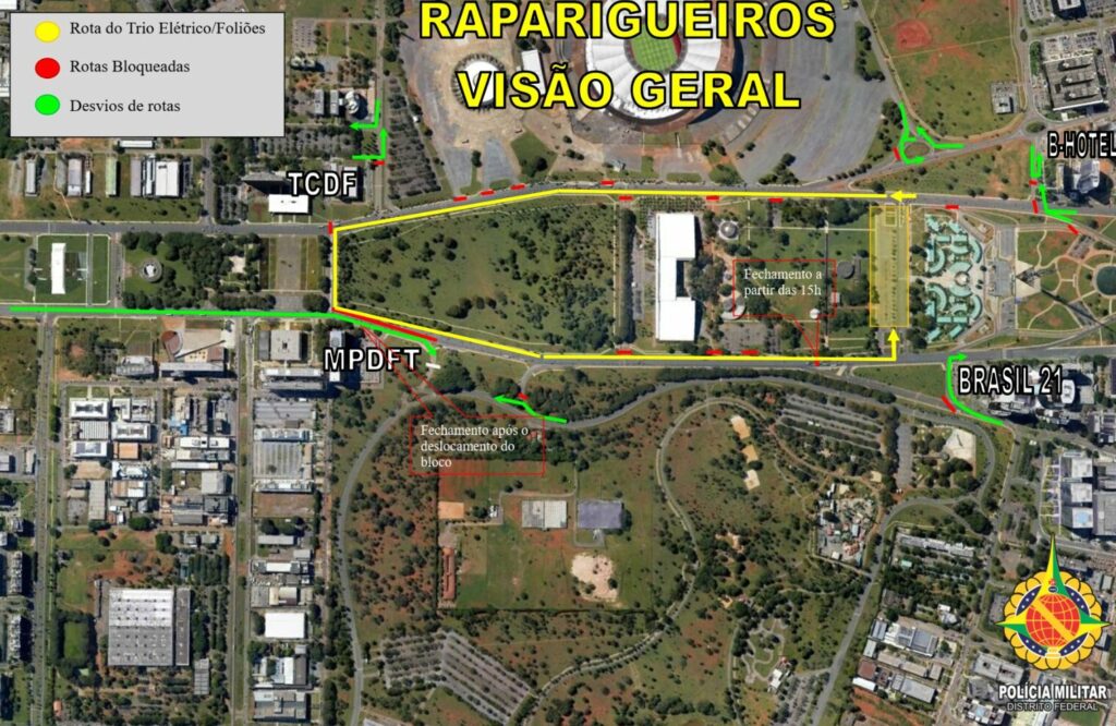 Há interdições previstas para domingo (19) e terça-feira (21) no Plano Piloto, devido à passagem de blocos. Nesses dias, a partir das 15h, o trânsito na via N1 será bloqueado nas proximidades da Torre de TV. Os motoristas serão direcionados para a via N2, entre os shopping centers da região e o Setor Hoteleiro Norte.