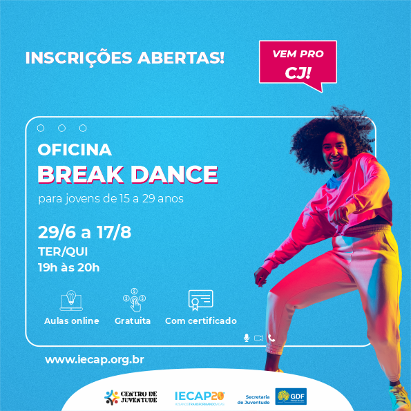 Em parceria com o Instituto de Educação, Esporte, Cultura e Artes Populares (Iecap), a Secretaria de Juventude (Sejuv) lançará uma oficina de break dance. As atividades serão desenvolvidas por meio dos centros de Juventude (CJ), com aulas online e gratuitas às terças e quinta-feira, das 19h às 20h.