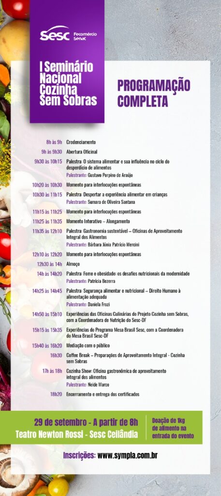O 1º Seminário Nacional Cozinha Sem Sobras, promovido pelo SESC-DF será realizado na quinta-feira (29), das 8h às 18h, na unidade SESC-Ceilândia, sob a temática: “Aproveitar sem Desperdiçar”. O Seminário tem o objetivo de difundir informações de caráter educativo e social, para fomentar o compromisso contra o desperdício alimentar.