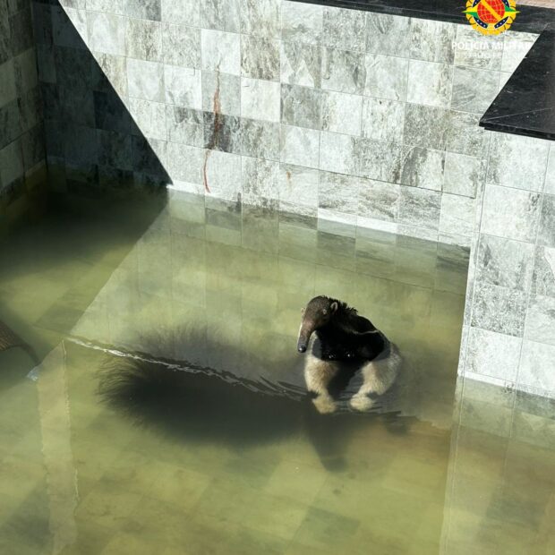 No local, os policiais constataram que o animal havia caído na água e não conseguia sair sozinho. A equipe realizou a captura de forma cuidadosa, adotando técnicas adequadas para evitar estresse ou lesões, garantindo a integridade do tamanduá-bandeira.