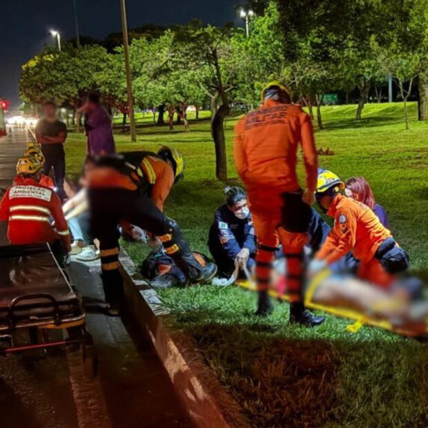 No local, as equipes constataram que se tratava de dois acidentes relacionados. Na primeira ocorrência, uma motocicleta com dois ocupantes atropelou uma pedestre adulta. A mulher apresentava ferimento na cabeça e quadro de instabilidade. O condutor da moto sofreu suspeita de fratura no ombro, enquanto a passageira teve escoriações pelo corpo. As três vítimas receberam atendimento pré-hospitalar conforme os protocolos de trauma e foram encaminhadas a unidades de saúde, após regulação médica.