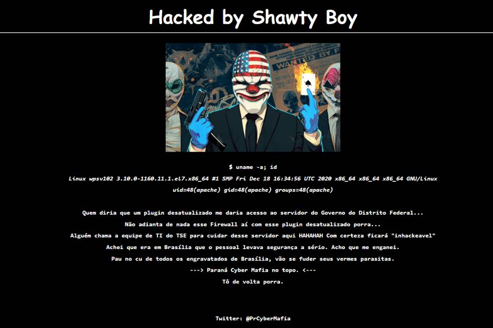 Nos sites, apareciam a seguinte mensagem: “Quem diria que um plugin desatualizado me daria acesso ao servidor do Governo do Distrito Federal… Não adianta de nada esse Firewall aí com esse plugin desatualizado porra…Alguém chama a equipe de TI do TSE para cuidar desse servidor aqui HAHAHAH Com certeza ficará ‘inhackeavel’. Achei que era em Brasília que o pessoal levava segurança a sério. Acho que me enganei. Pau no cu de todos os engravatados de Brasília, vão se fuder seus vermes parasitas”.