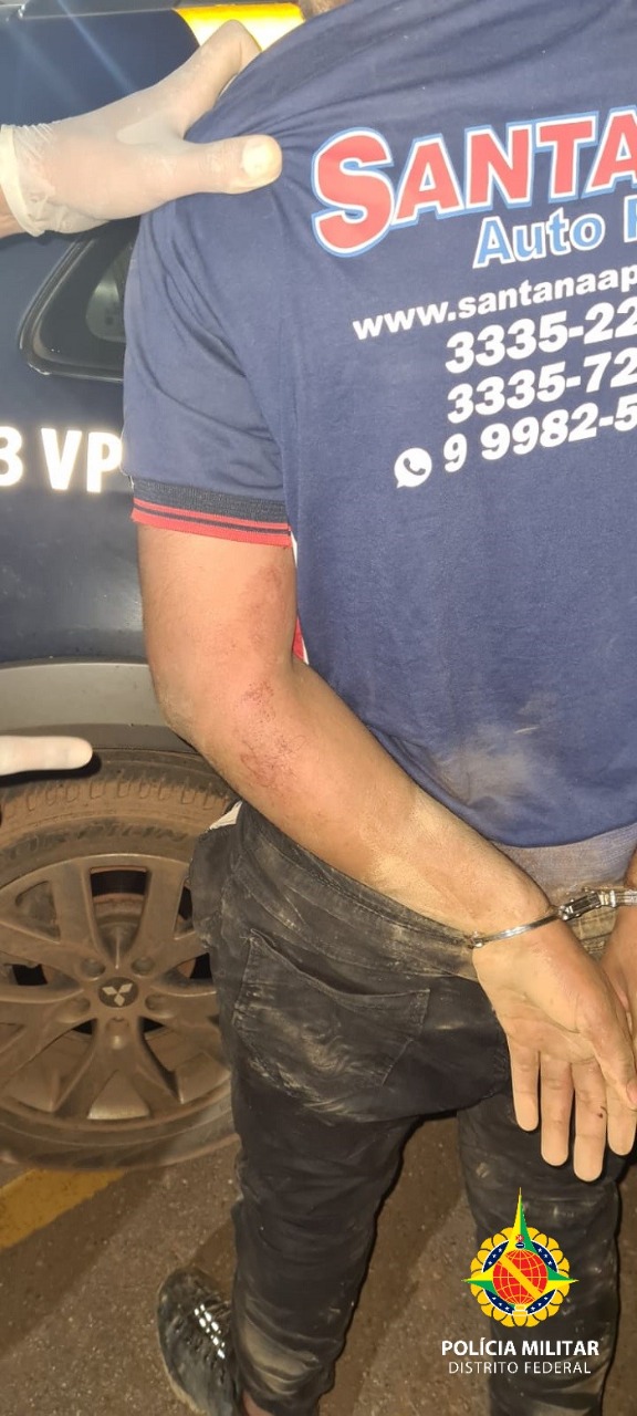 Já no local do crime, a equipe do 21º Batalhão de Polícia Militar do Distrito Federal, visualizou o veículo, em movimento. O Fiat Uno estaria vindo em direção a viatura, quando foi dado o comando de parada, através dos sinais luminosos e sonoros de praxe, bem como dada a ordem de desembarque do suspeito.