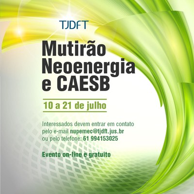 O Tribunal de Justiça do Distrito Federal e dos Territórios (TJDFT) irá realizar de 10 a 21 de julho mutirão de conciliação, gratuito e on-line, voltado para as pessoas em débito com a Neoenergia e Caesb. O evento, coordenado pelo 4º Núcleo Virtual de Mediação e Conciliação (4º NUVIMEC), irá atender casos indicados pelas empresas e demandas de interessados em negociar dívidas.