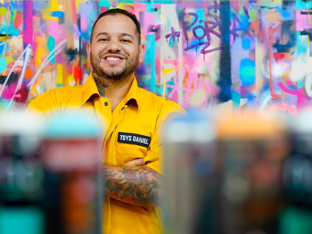 Toys, que também é formado em Publicidade e Propaganda, ganhou notoriedade com o personagem Toyszinho. Sua arte explora a linguagem geométrica, abstrata, colorida e com infinitas texturas, com potencialidade para circular em ambientes diversos: quadros, murais, roupas, joias, objetos, acessórios…