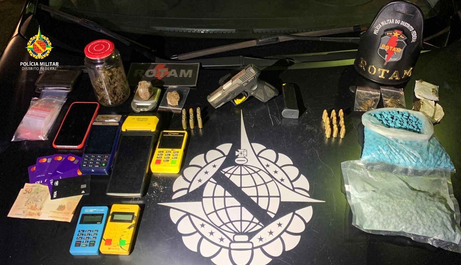 Na noite desta segunda-feira (25), a Polícia Militar do Distrito Federal (PMDF) realizou uma operação que resultou na prisão de um traficante e na apreensão de uma impressionante quantidade de drogas, armas e munições na QR 511, no Recanto das Emas.