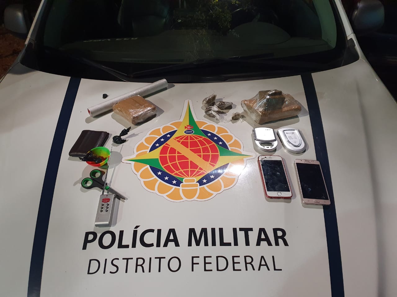 Na casa do passageiro, após autorização, foram encontrados uma balança de precisão, filme plástico, tesoura, um bloqueador de alarme veicular e uma porção de maconha de aproximadamente 500g. Os dois detidos foram conduzidos à 1ª DP para providencias.