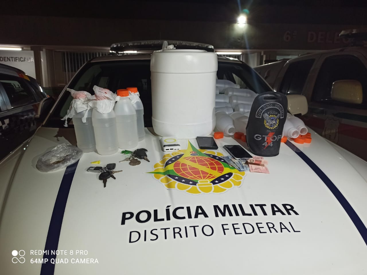 O trio, que mora no Paranoá, estava em um Renault Sandero. Dentro do carro, foram encontradas seis garrafas pequenas e um galão que armazenavam a substância.
