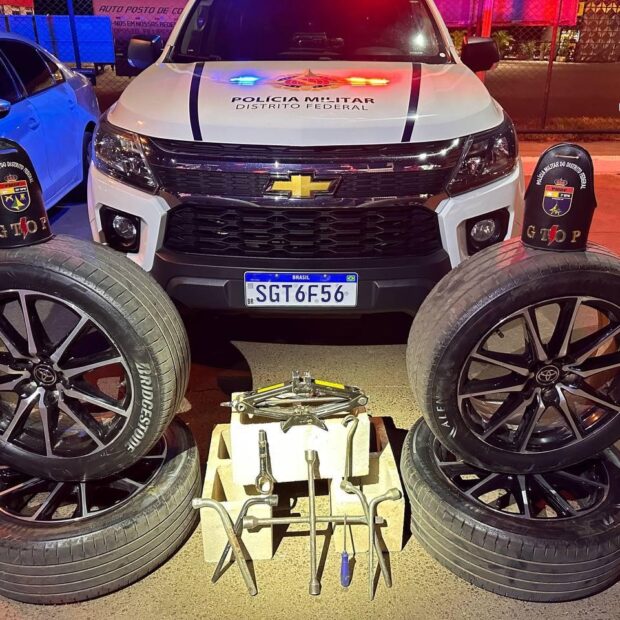 Dois homens e uma mulher foram detidos na madrugada deste sábado por policiais militares do Grupo Tático Operacional do 25º Batalhão (Gtop 45), suspeitos de furtar pneus de um veículo no Núcleo Bandeirante. A ação teve início quando uma testemunha reportou o furto ocorrido na Terceira Avenida, fornecendo também a placa do carro utilizado pelos suspeitos.