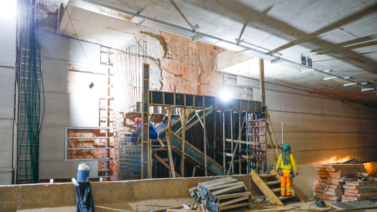 “O local onde ela está sendo erguida era ocupado pelo acesso provisório à área técnica do Túnel de Taguatinga. Com a escada norte pronta, pudemos desmontar a estrutura de madeira que era usada pelos operários”, explica Renes. “E começamos hoje mesmo a concretagem da última escada.”