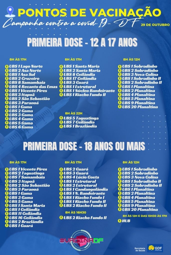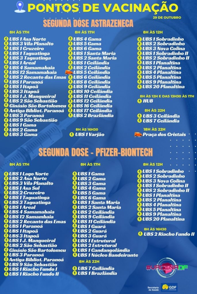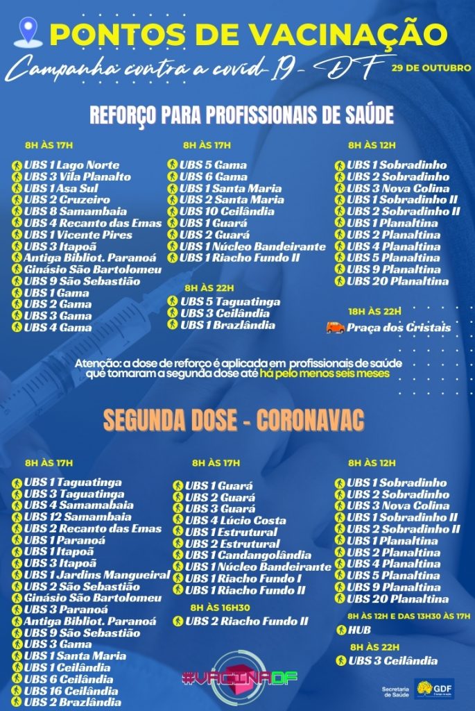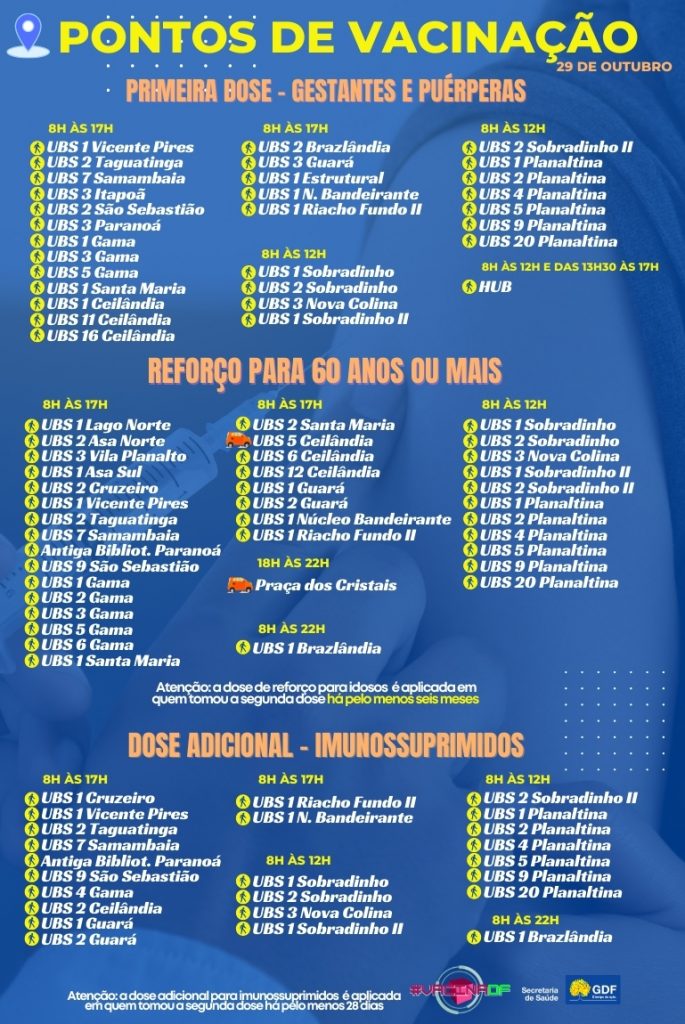 Nesta sexta feira (29), diversos pontos de vacinação contra a covid-19 estarão abertos, alguns das 8h às 17h, outros até as 12h e outros até as 22h. Esses locais oferecem a aplicação da primeira dose para pessoas com 30 anos ou mais, gestantes e puérperas; e para quem se encontra no período devidamente indicado no cartão, a segunda dose.