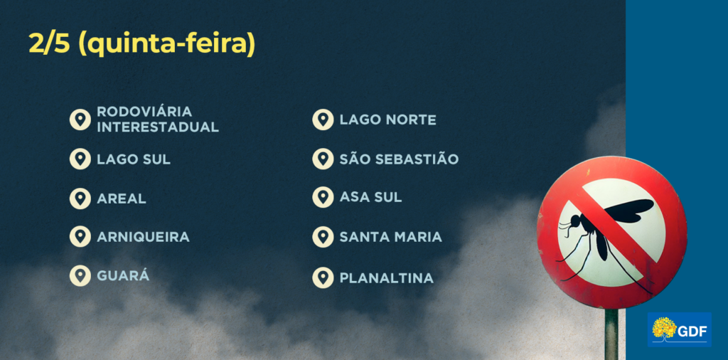 Recomendação da Vigilância Ambiental é que as pessoas abram portas e janelas das residências quando passar o veículo do inseticida de ultrabaixo volume (UBV), para maior eficácia do produto. As aplicações serão feitas das 4h às 6h e das 17h às 19h.