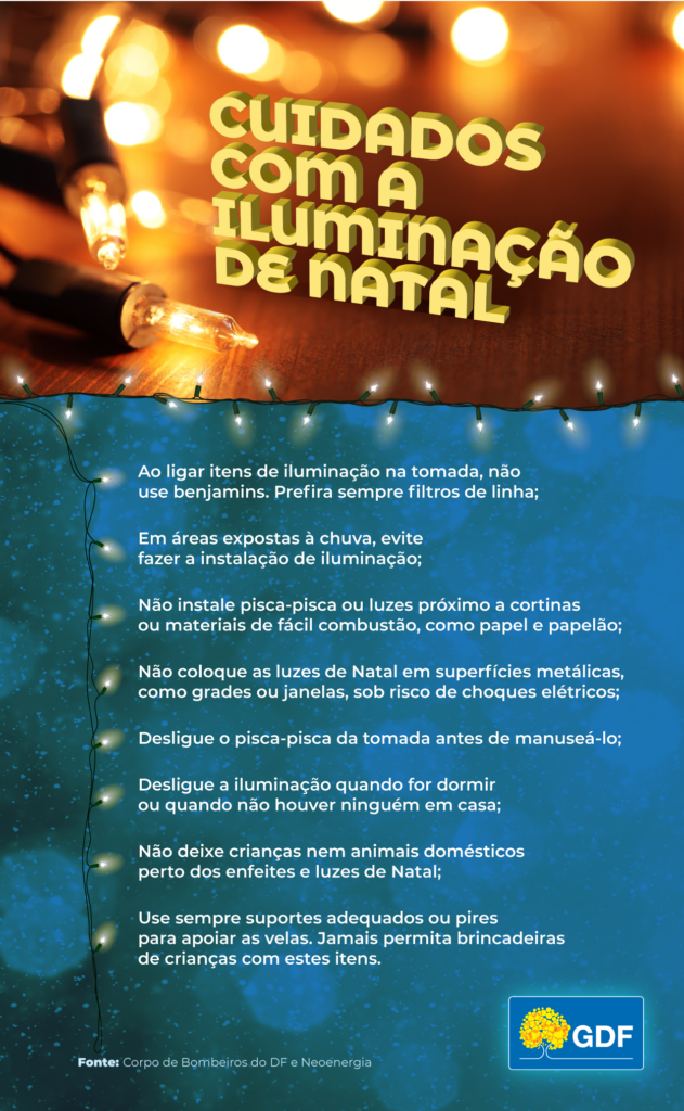 Natal é tempo de celebração. Para enfeitar a casa, nesta época do ano, o uso de lâmpadas, pisca-pisca e até mesmo velas é um velho hábito do brasileiro. É ainda uma forma de dar brilho à tão esperada árvore natalina. Para que tudo ocorra com segurança e não estrague a festa, são necessários alguns cuidados recomendados pelo Corpo de Bombeiros e pela Neoenergia Brasília.