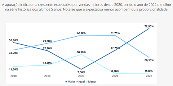 Ainda de acordo com a pesquisa sobre a expectativa de compras e vendas, 72,9% dos empresários acham que as vendas serão melhores que no ano passado, quase dobrando.