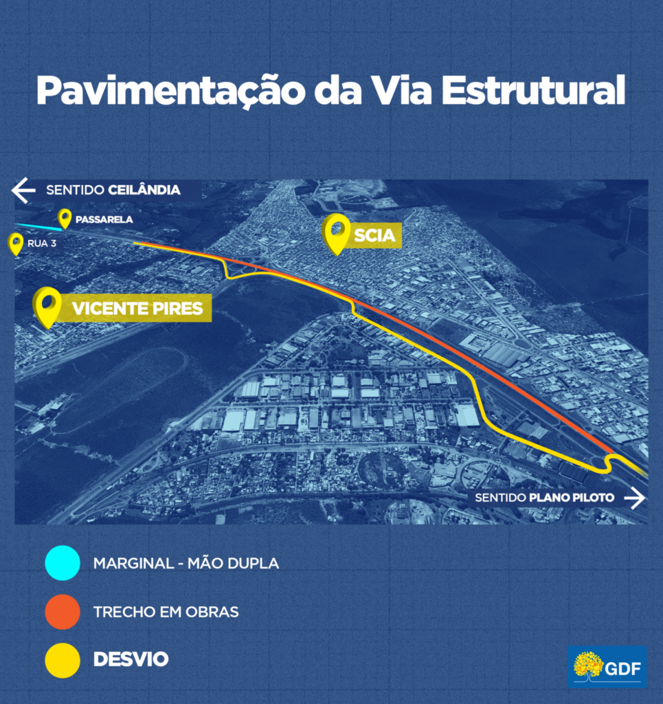 A Via Estrutural sofrerá, a partir desta sexta-feira (28), às 21h, um desvio no trânsito devido às obras de pavimentação em concreto. Segundo o Departamento de Estradas de Rodagem do Distrito Federal (DER-DF), o fluxo de carros na pista sul, sentido Ceilândia-Plano Piloto, será desviado para a marginal de Vicente Pires.