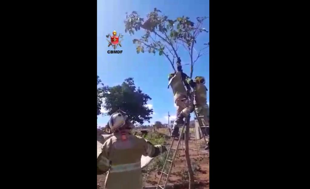 O animal foi encontrado em uma chácara próxima ao Parque Sucupira, em Planaltina. Para fugir dos cães da propriedade, o bicho subiu em uma árvore.
