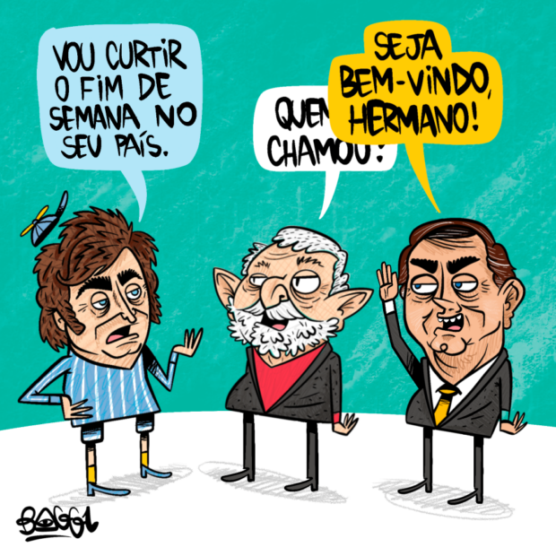 Imagine a cena: Javier Milei desembarca animado no Brasil, pronto para aproveitar um fim de semana no país tropical. Ao cruzar a entrada, ele se depara com Lula e Bolsonaro, que parecem discutir algo com expressões sérias. Sem hesitar, Milei solta com seu sotaque marcante: “Vim curtir o fim de semana no seu país, hermano.”