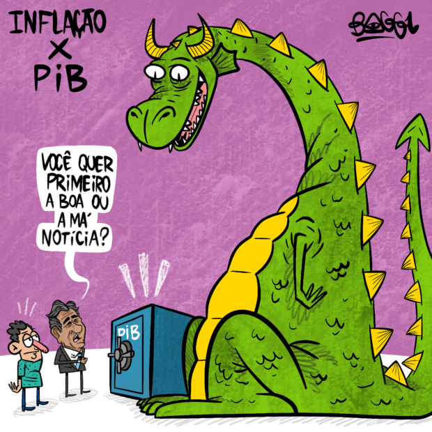 Haddad estava ao lado de um brasileiro, ambos observando um cofre marcado com “PIB” e um monstruoso personagem representando a inflação. Haddad hesitou por um momento antes de começar a explicar as novidades econômicas do dia.
