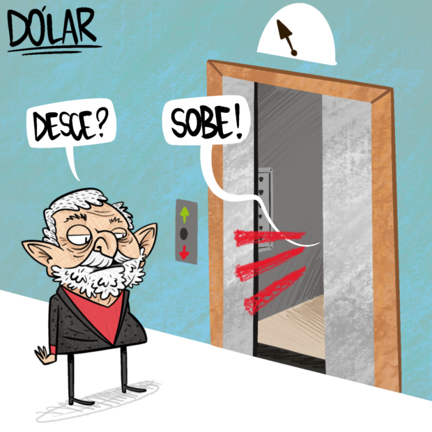 Do interior do elevador, uma voz responde com um leve sotaque de mercado internacional: “Não, Lula, está subindo!”