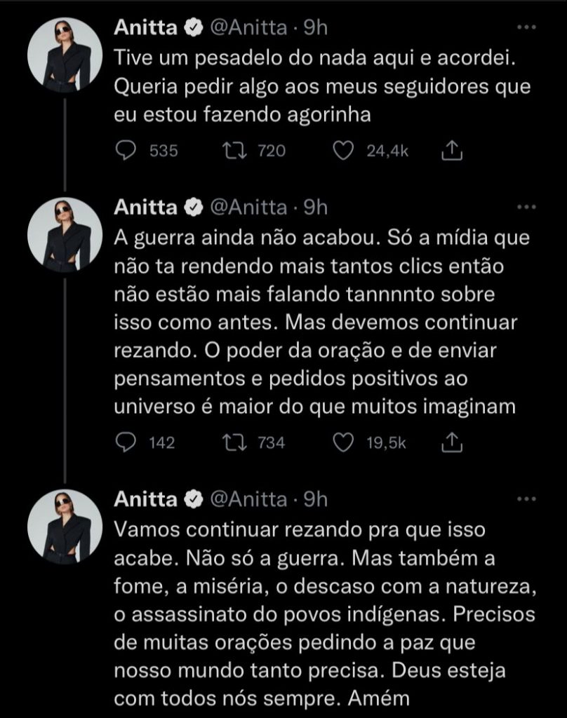 A cantora Anitta se posicionou contra a guerra na Ucrânia e pediu que seus fãs rezem para que o conflito acabe.