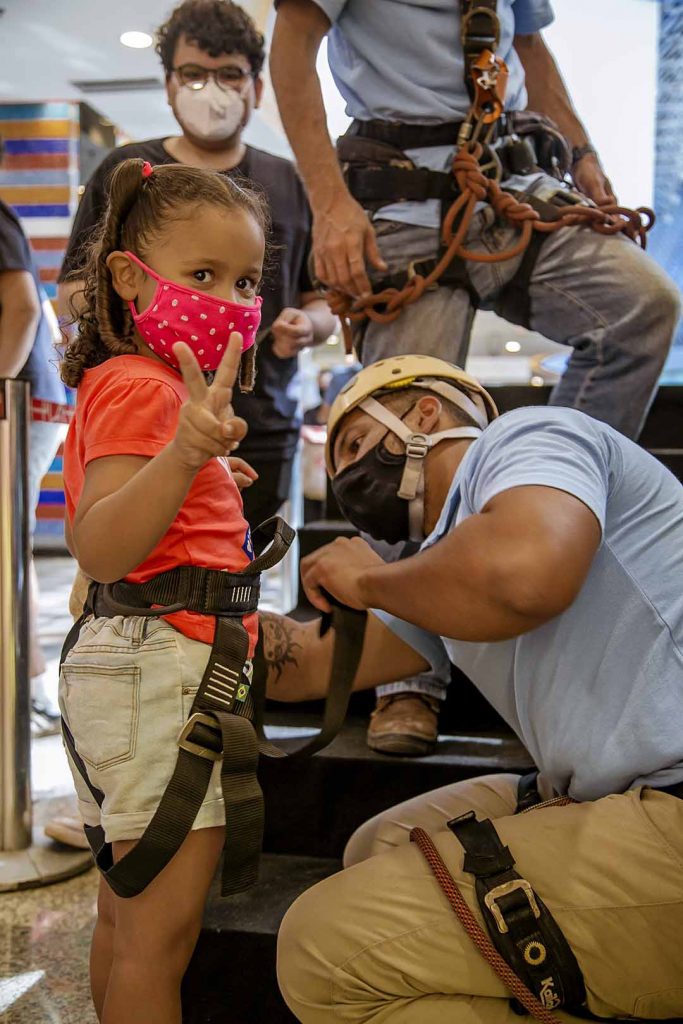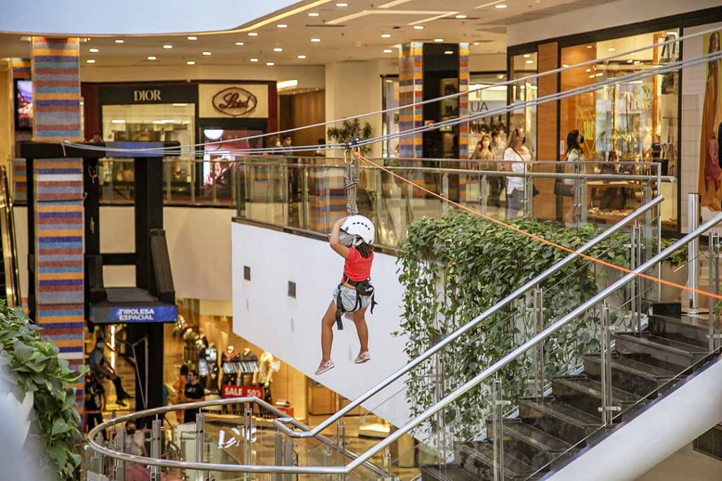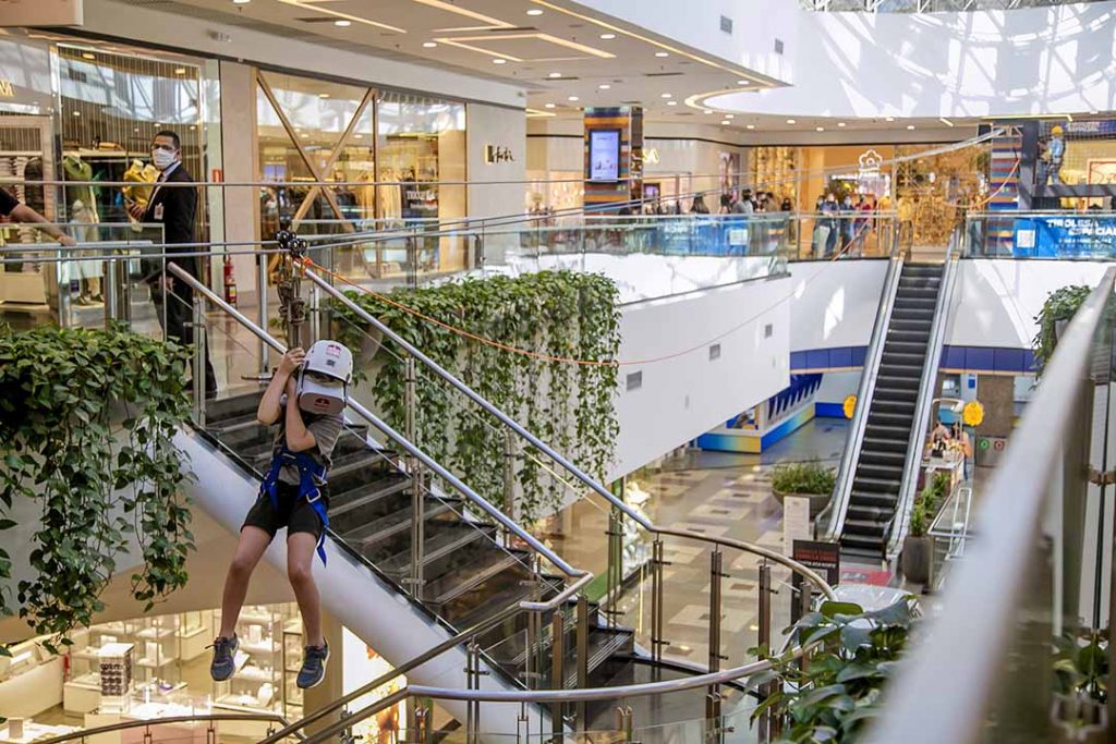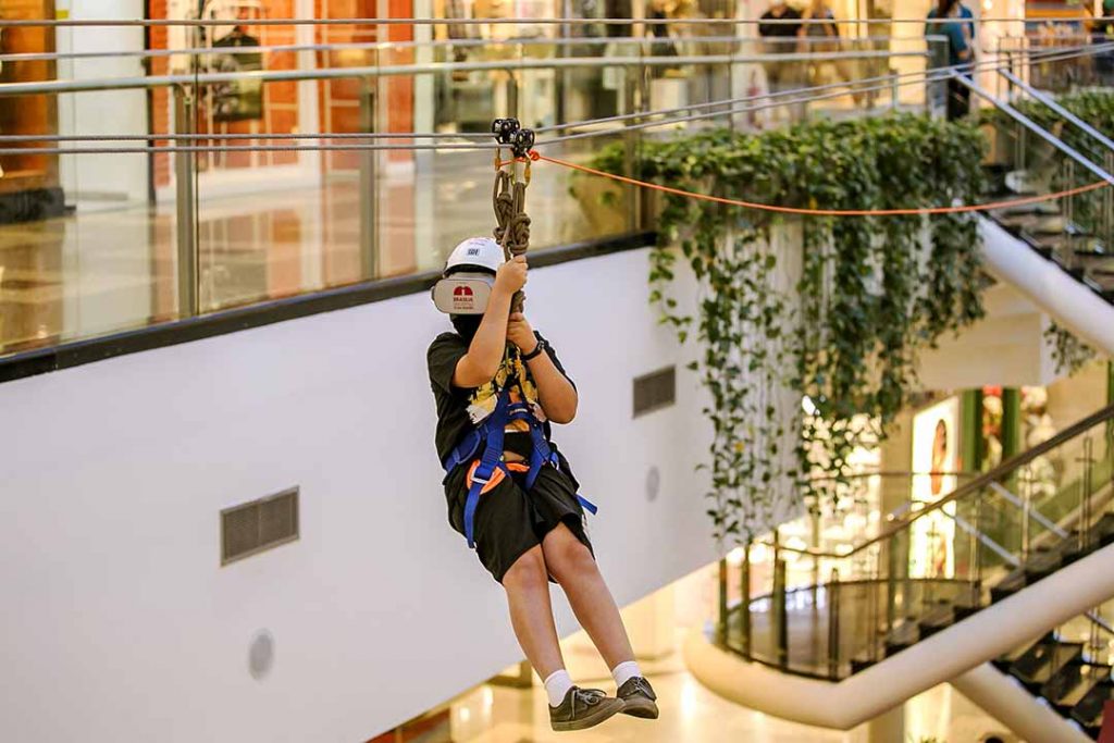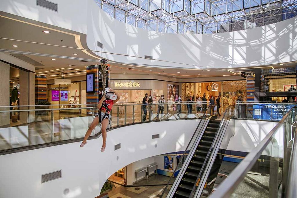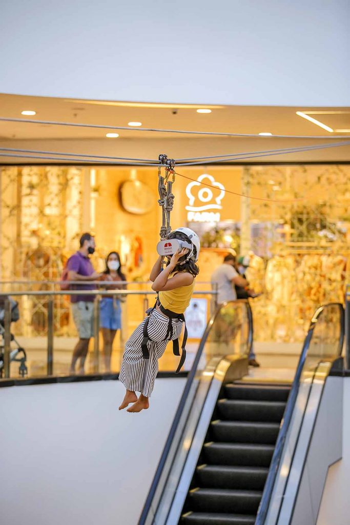 Garantindo a segurança, os participantes são paramentados com cordas, mosquetões e capacetes e a dinâmica é acompanhada por instrutores habilitados. Além disso, após a utilização, todos os itens são devidamente higienizados. O embarque da atividade acontece no 2º Piso, na frente da Farm, e a chegada no Piso 1, próximo ao quiosque na Chilli Beans.