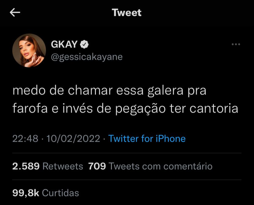 Em seu perfil do Twitter, a humorista afirmou ter medo de convidar os participantes para a “Farofa da Gkay”, evento de comemoração do seu aniversário, e não ter pegação. “Medo de chamar essa galera para farofa e ao invés de pegação ter cantoria”, afirmou.