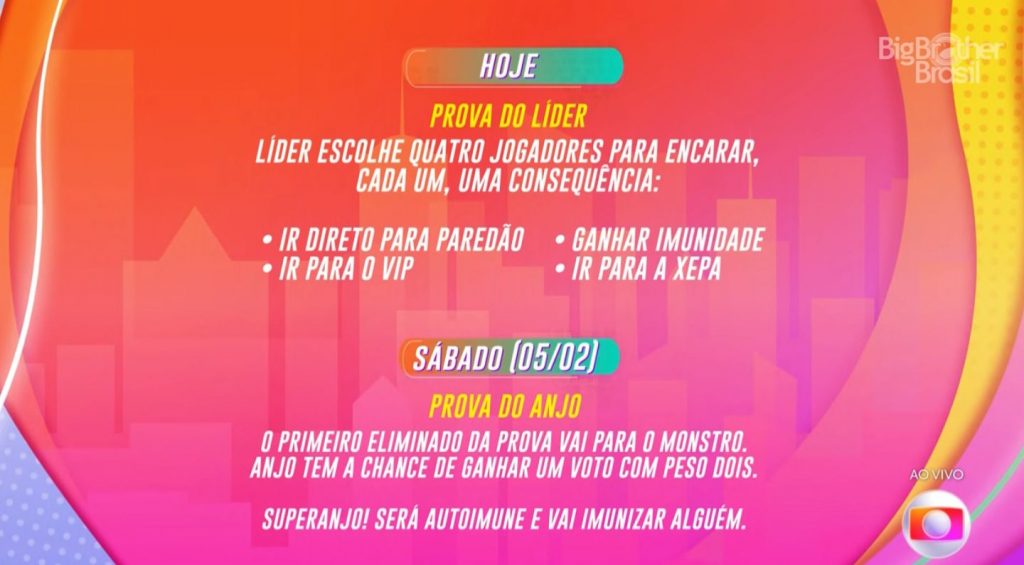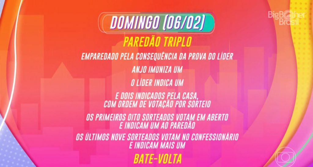 No domingo, funcionará da seguinte forma: emparedado pela consequência do Líder [Naiara]; Anjo imuniza um; o Líder indica um; e dois indicados pela casa, com ordem de votação por sorteio.