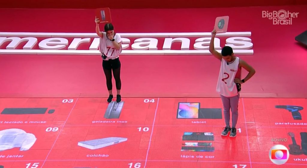 “Hoje, a Prova do Líder é Americanas. Vamos às regras: a cada rodada, você deverá pegar o produto no carrinho de compras. No telão, irão aparecer 18 produtos e você deverá identificar a última posição em que seu produto apareceu. Terá que subir no piso de LED e se posicionar sobre o número no qual o seu produto apareceu por último. Toda vez que você acertar um número, você pontua”, detalhou Tadeu.