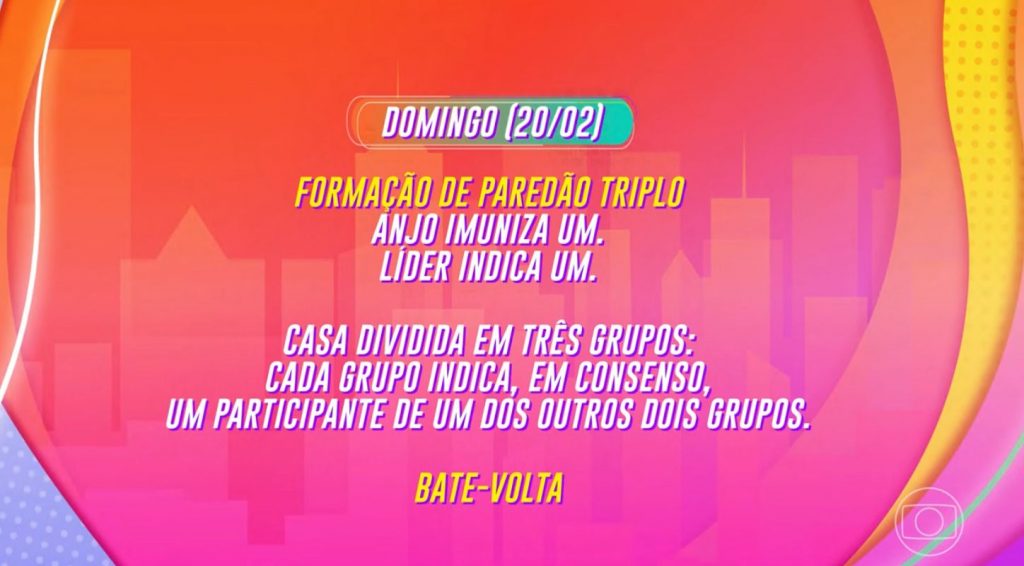 Domingo será a formação do paredão triplo. O Anjo escolhe um brother para imunizar; O Líder indica um direto ao paredão; Depois a casa será dividida em três grupos: cada grupo indica, em consenso, um participante de um dos outros dois grupos.