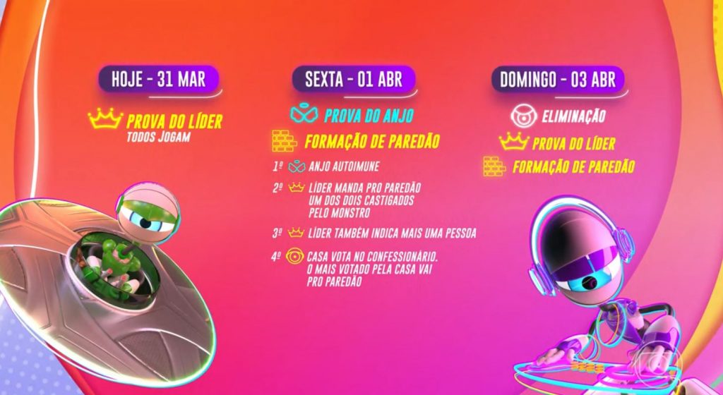 Depois disso, no próprio domingo haverá uma nova prova do Líder e mais uma formação de paredão para eliminação na terça (5) que vem. Mais detalhes depois disso só serão divulgados mais para frente, mas Boninho já avisou pelas redes sociais que haverá eliminação toda terça e domingo até o final.