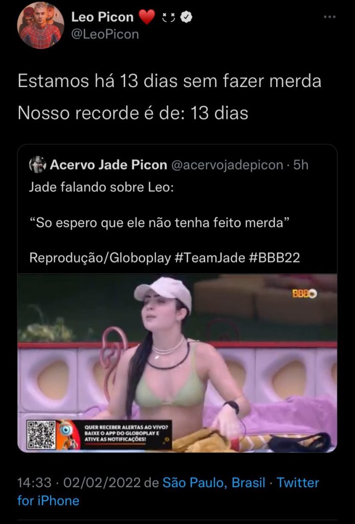 Após ver o relato da irmã dentro do BBB sobre o ‘puxão de orelha’, Leo Picon brincou em seu Twitter: “Estamos há 13 dias sem fazer merd*. Nosso recorde é 13 dias”.