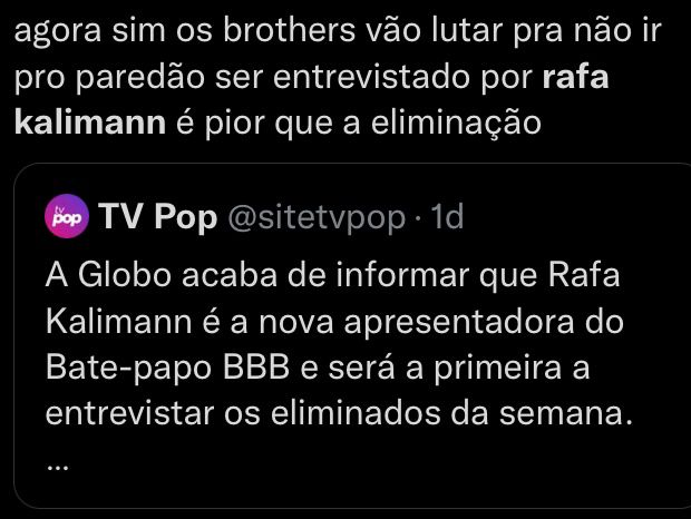 “Agora sim os brothers vão lutar pra não ir pro paredão, ser entrevistado por Rafa Kalimann é pior que a eliminação” escreveu outro seguidor.
