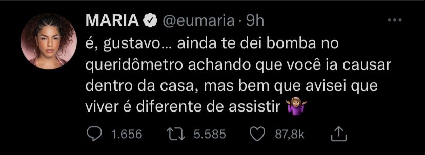 “É, Gustavo… ainda te dei bomba no queridômetro achando que você ia causar dentro da casa, mas bem que avisei que viver é diferente de assistir”, escreveu Maria em seu perfil oficial do Twitter, onde tem interagido com o público.