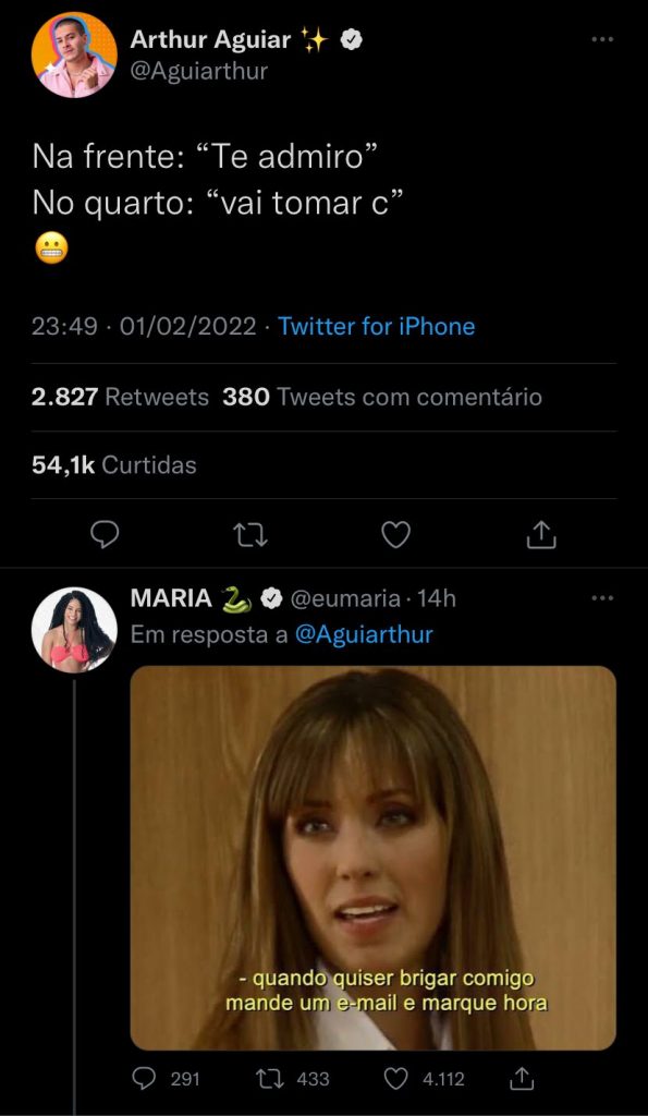 O jogo da discórdia desta semana deu no que falar. Arthur Aguiar e Maria protagonizaram uma das discussões que rolou na dinâmica e também, depois do programa ao vivo. Acontece que, os adm’s do ator postaram no Twitter as falas da sister, só não esperavam receber a resposta do perfil dela.