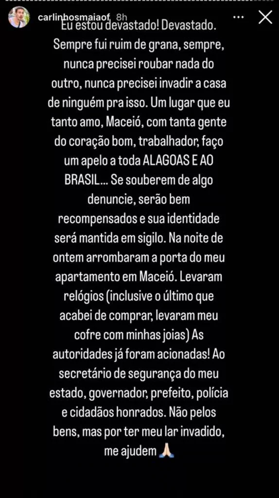 “Estou devastado. Devastado. Sempre fui ruim de grana, sempre, nunca precisei roubar nada do outro, nunca precisei invadir a casa de ninguém para isso. Um lugar que tanto amo, Maceió, com tanta gente de coração bom, trabalhador, faço um apelo a toda Alagoas e ao Brasil… Se souberem de algo, denuncie, serão bem recompensados e sua identidade será mantida em sigilo”, disse.