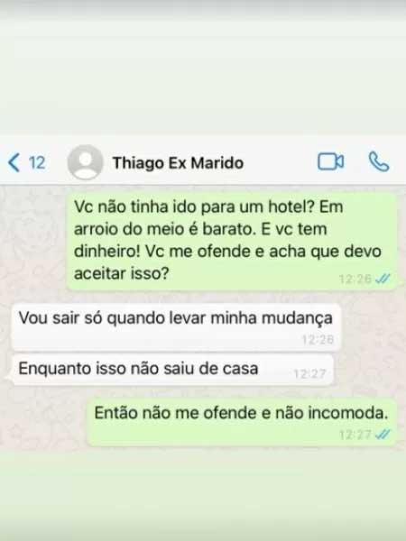 A modelo divulgou trechos de conversas no celular atribuídas ao ex-marido Thiago Lopes. Nas duas capturas de telas que ela exibiu no Instagram, Urach respondeu sobre a saída dele da residência e disse que foi traída pelo companheiro. Pelas mensagens, Thiago disse que Urach estava “transtornada”.