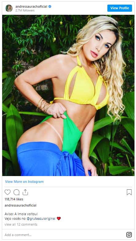 Andressa fez um post no Instagram em que aparece de top e biquíni cavado com a seguinte legenda: “Aviso: a Imola voltou”. Para quem não se lembra, ou não sabia, “Imola” é o nome que ela usava na época em que se prostituía. No post, ela ainda avisou que veria os fãs no Gruta Azul, nome de uma boate de entretenimento adulto em Porto Alegre, no Rio Grande do Sul.