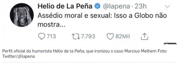 Hélio de la Peña usou o perfil oficial dele no Twitter nesta segunda-feira, 7, para fazer uma ironia sobre o caso de assédio sexual envolvendo o ator e ex-diretor da Globo Marcius Melhem e a atriz Dani Calabresa.
