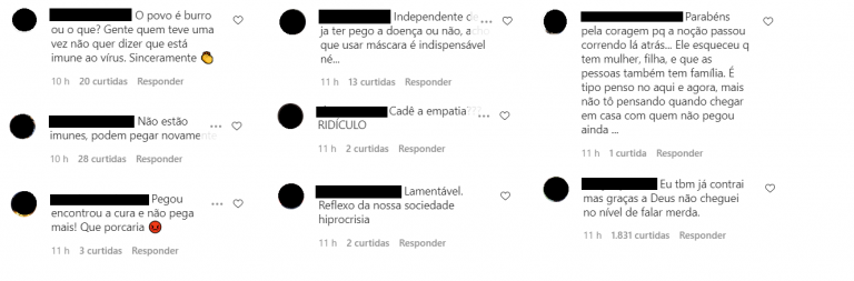 “Não estão imunes, podem pegar novamente”, afirmou um perfil no Instagram. “Pegou, encontrou a cura e não pega mais! Que porcaria”, ironizou outro. “Eu também já contraí, mas graças a Deus não cheguei no nível de falar m*rda”, disparou mais uma usuária.