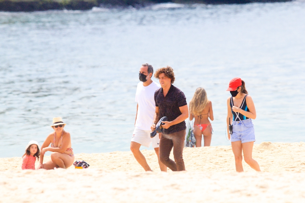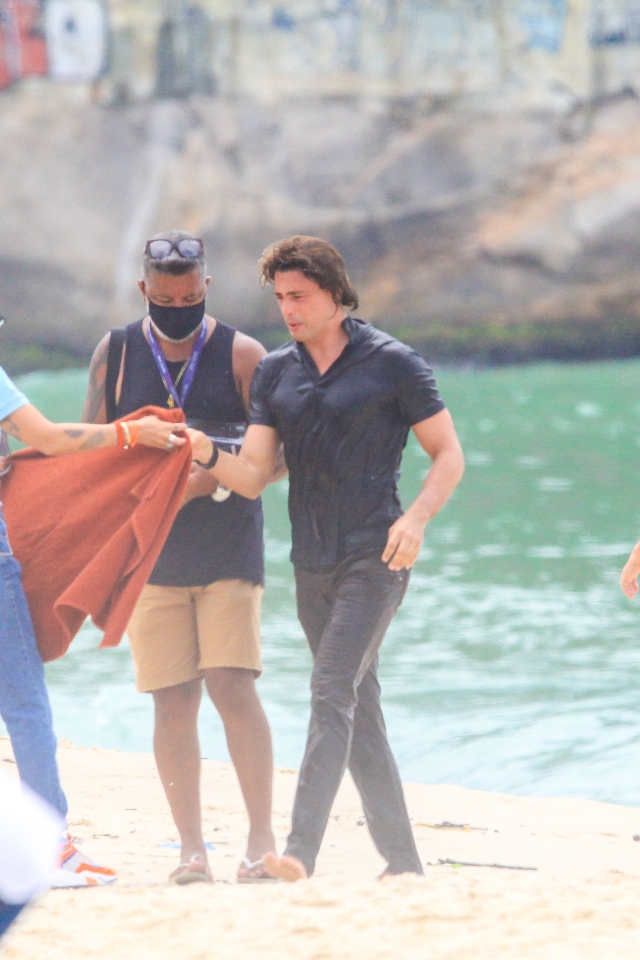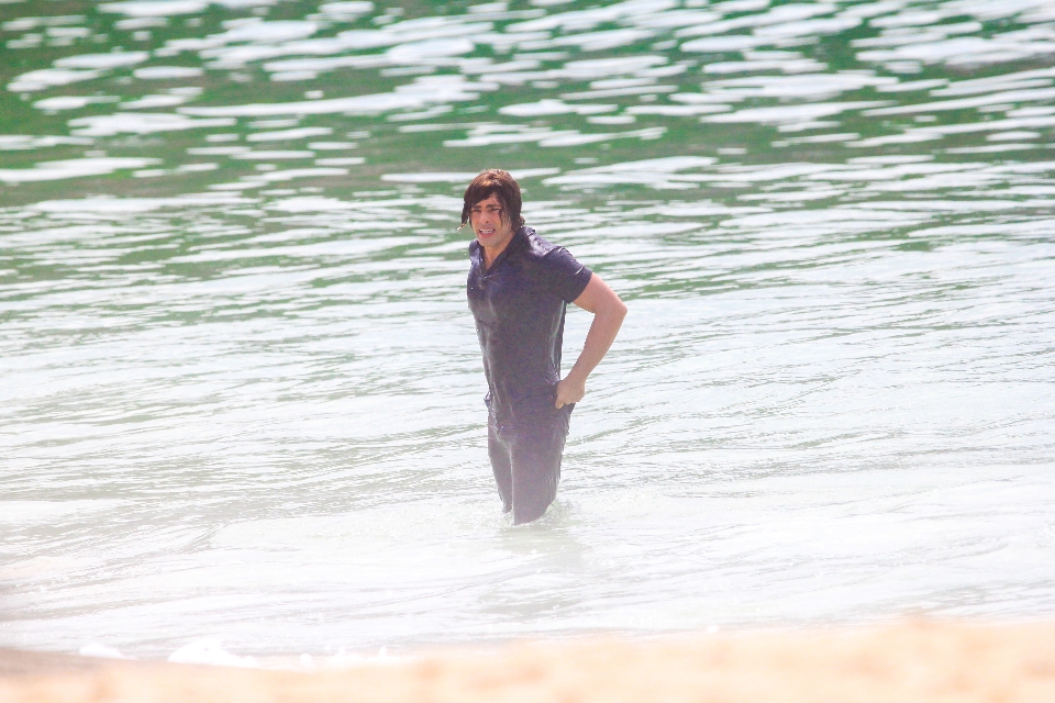 Cauã Reymond foi fotografado gravando cenas da próxima novela das 9, Um Lugar Ao Sol, nesta quinta-feira (18) na praia do Leme, no Rio. O ator, que vai interpretar gêmeos, aparece usando perucas diferentes e entrando no mar de roupa.