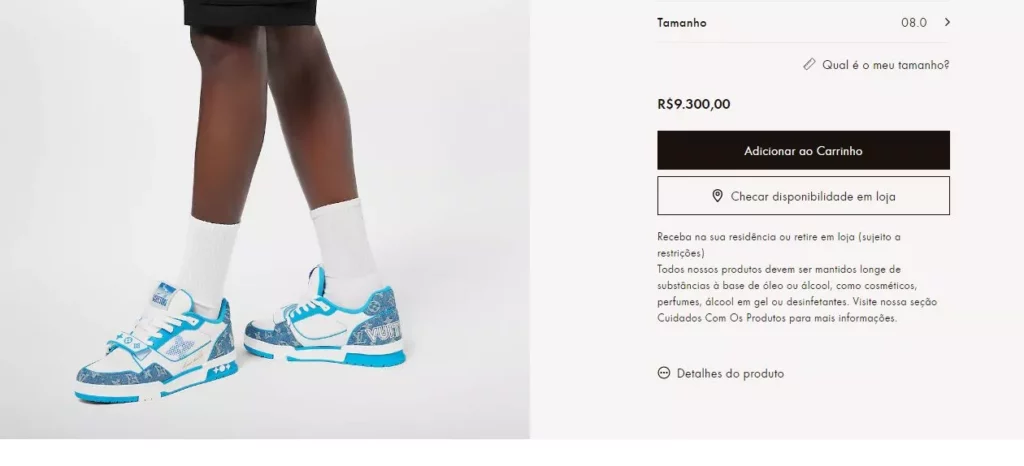 Com um tênis Louis Vuitton, que pode ser adquirido por R$ 9,3 mil, e um chapéu da mesma grife, modelo Match Bucket Hat, avaliado em R$ 3,5 mil.
