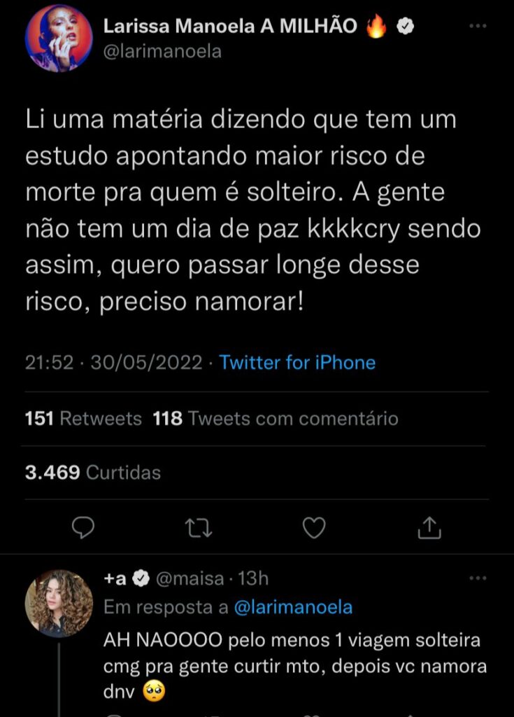 Larissa Manoela, de 21 anos, brincou em seu Twitter, na última quarta-feira (1), que quer namorar novamente. Solteira desde fevereiro de 2021, a atriz comentou o assunto ao dizer que havia lido que há maior risco de morte para quem é solteiro.