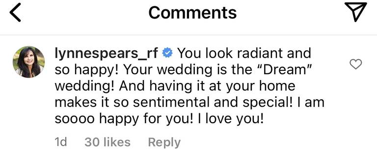 Lynne Spears, 67, deixou um comentário em uma publicação de Brintey. “Você parece radiante e tão feliz! Seu casamento é o casamento dos ‘sonhos’! E tê-lo em sua casa o torna tão sentimental e especial! Estou tão feliz por você! Eu te amo!”, completou.