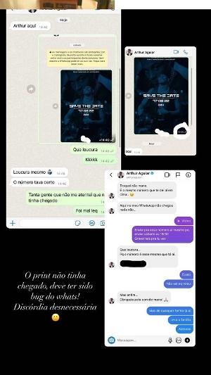 Depois dessa fala, o atleta mostrou print da conversa com Arthur, onde mostra o convite que foi enviado no último sábado por volta das 16h50 da tarde. O campeão do BBB 22 ainda disse nas mensagens: “Que loucura… porque é esse mesmo número que está aí. Mas enfim… obrigado pelo convite, mano”. Arthur não se pronunciou até agora sobre o assunto.