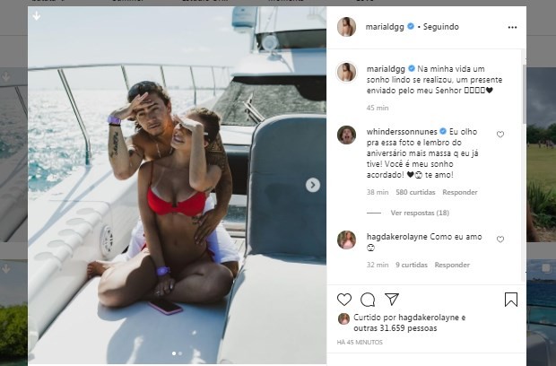 Nos comentários, Whindersson também se declarou à amada. “Eu olho pra essa foto e lembro do aniversário mais massa que eu já tive! Você é meu sonho acordado! Te amo!”, escreveu o humorista, que completou 26 anos no último dia 5.