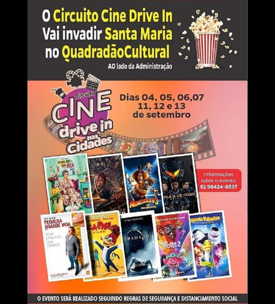 Com o objetivo de levar cultura e diversão à comunidade, o Circuito Cine Drive In nas Cidades irá percorrer as regiões administrativas de Santa Maria (setembro), Sobradinho (setembro), Samambaia (outubro), Planaltina (outubro), Brazlândia (outubro) e São Sebastião (novembro). A programação reúne filmes de sucesso de gêneros variados, como Minha Mãe é uma Peça 3 (comédia), Pica-Pau: o Filme (desenho) e O Chamado 3 (terror). Cada sessão comportará aproximadamente cem carros, sendo que cada veículo poderá ter até quatro pessoas. O ingresso equivale ao carro e para ser retirado basta baixar o aplicativo Sympla ou acessar o site www.sympla.com.br. O evento seguirá todo o protocolo de segurança, desde o distanciamento entre os carros, uso de álcool em gel e aferição de temperatura.
